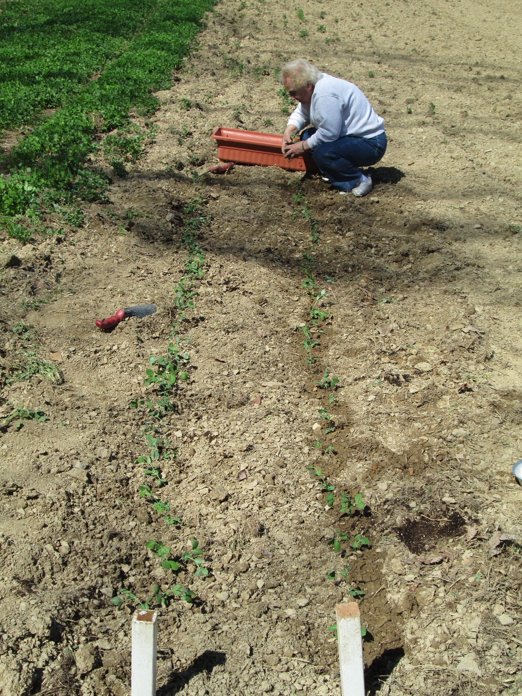 The family has been converging to work on a bunch of different projects up at the property almost daily (Glenn has his real person sized Tonka Toy set to prep his ground for the future retirement home), but yesterday we all rallied farm-side for some afternoon work. Mom weeded the garlic, Glenn dug a trench for 24 blueberrry bushes, and I planted mesclun, sorrel, flowers, fretted over the transplants and watered.